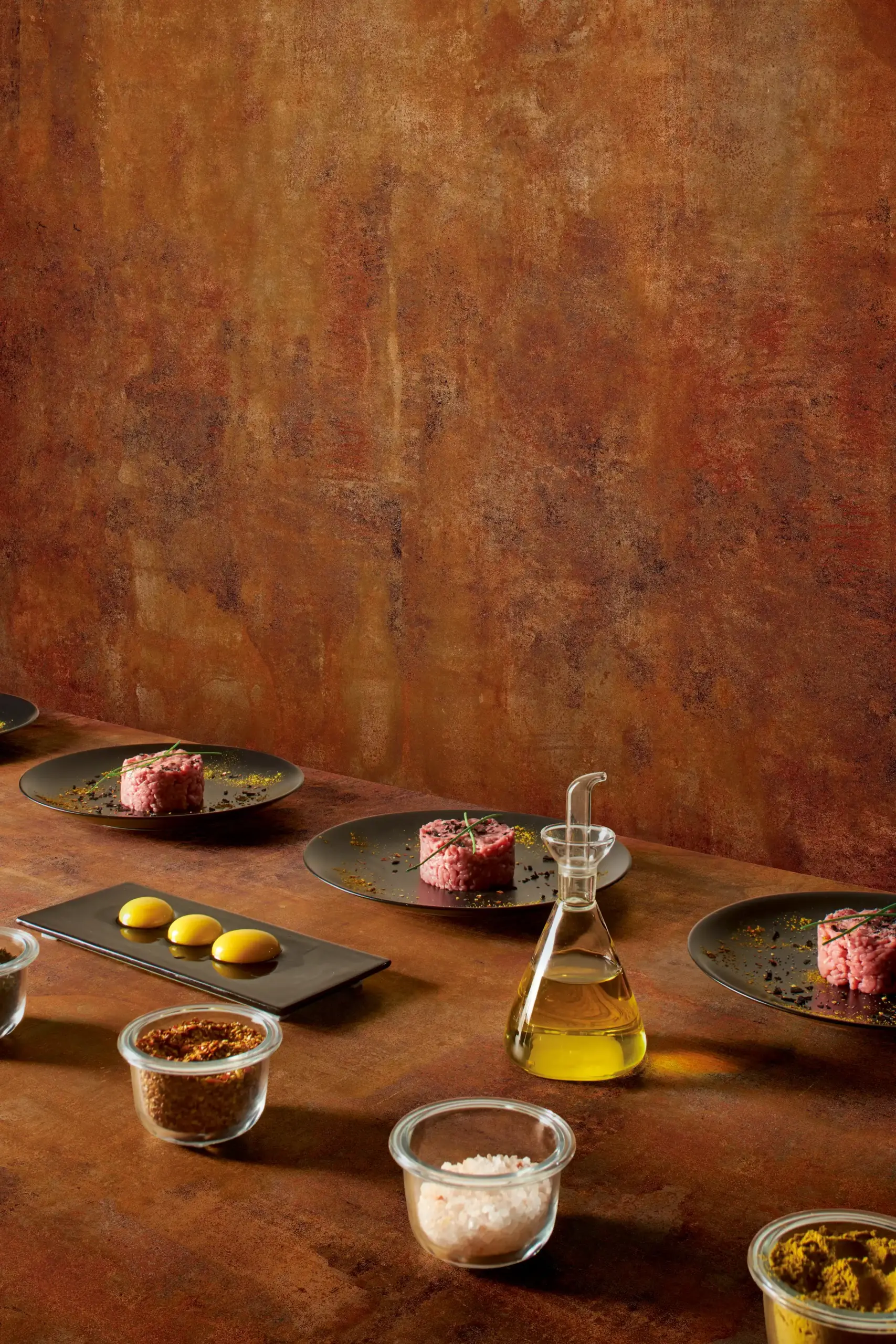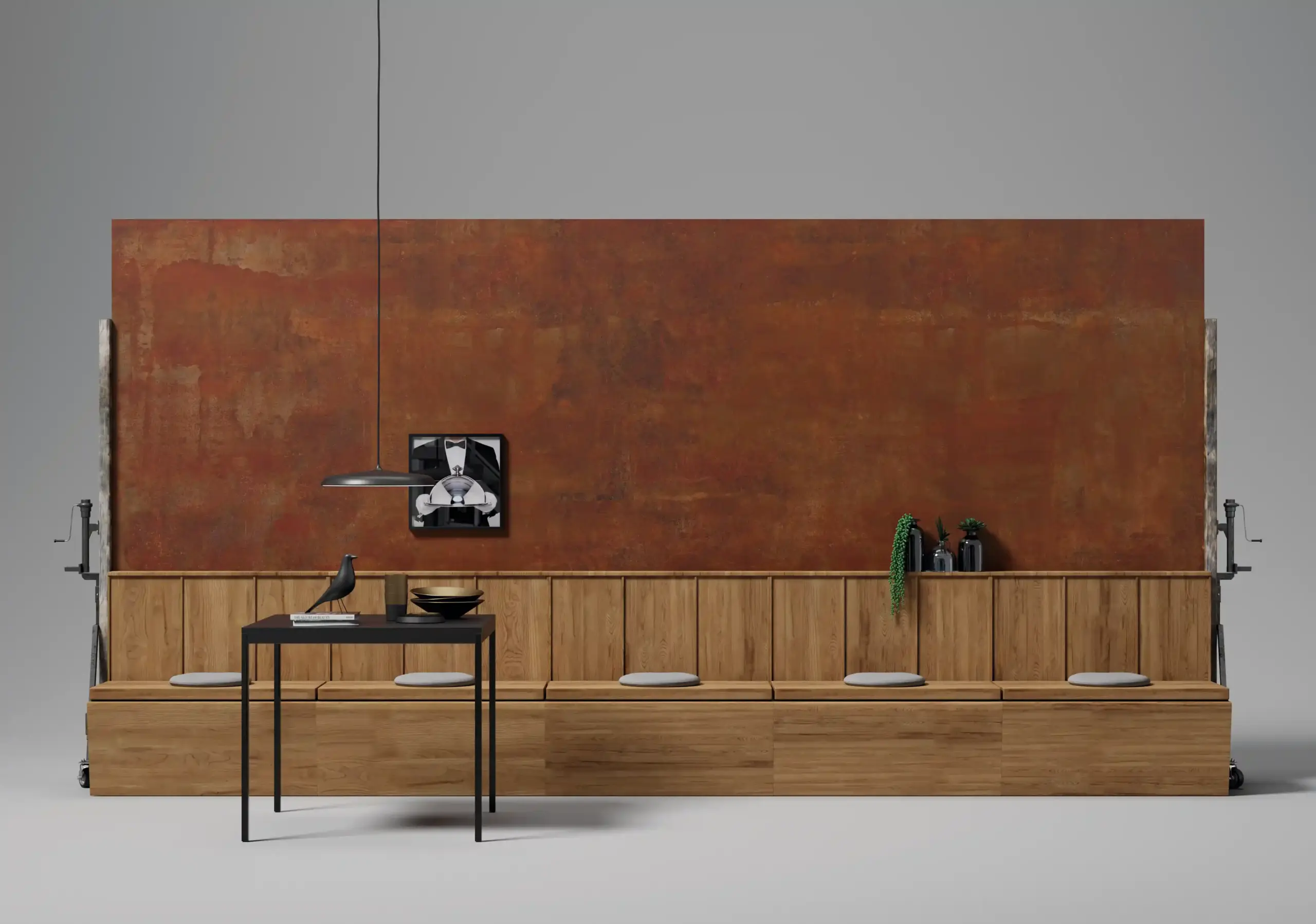 時間是一種抽象的概念,時光歲月走過的痕跡唯有肉眼才能見證曾經存在的證明,當新的事物逐漸凋零時,衰老的事物是否還能產出新的價值,我們試著想像撒在舊物上昏黃色的溫暖光芒,照印出沉澱其中舊有美好的優雅,並用現代工藝技術仿造出鏽蝕表面,讓斑駁感所散發出來的魅力,不單單只是物品表面的質感,也賦於整個空間充滿生命力,透過斑駁色彩帶進室內設計的世界,讓生命力與舊美好碰撞出新火花,讓抽象的時間概念,透過物品展現出來曾經存在的意義,表現出不完美的美。