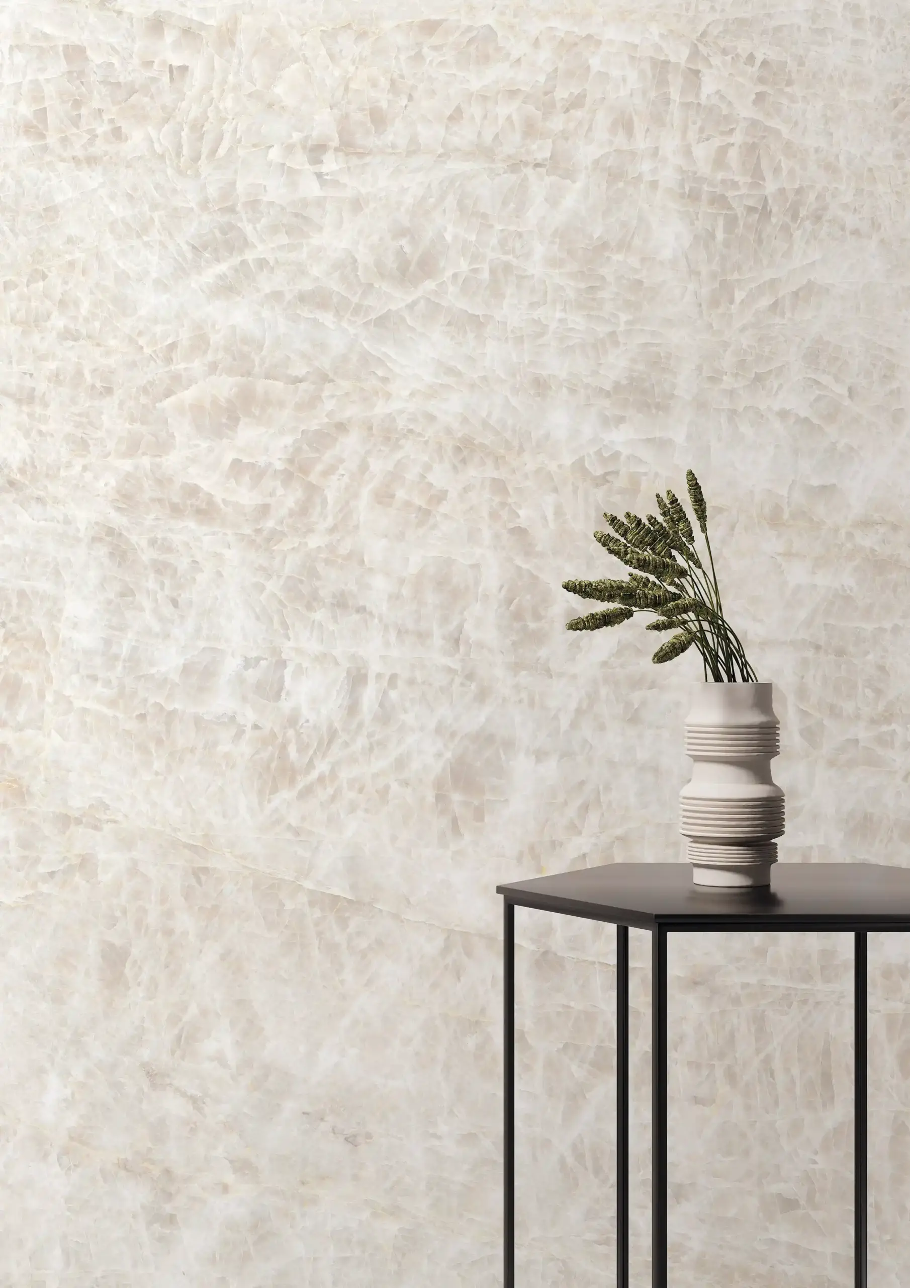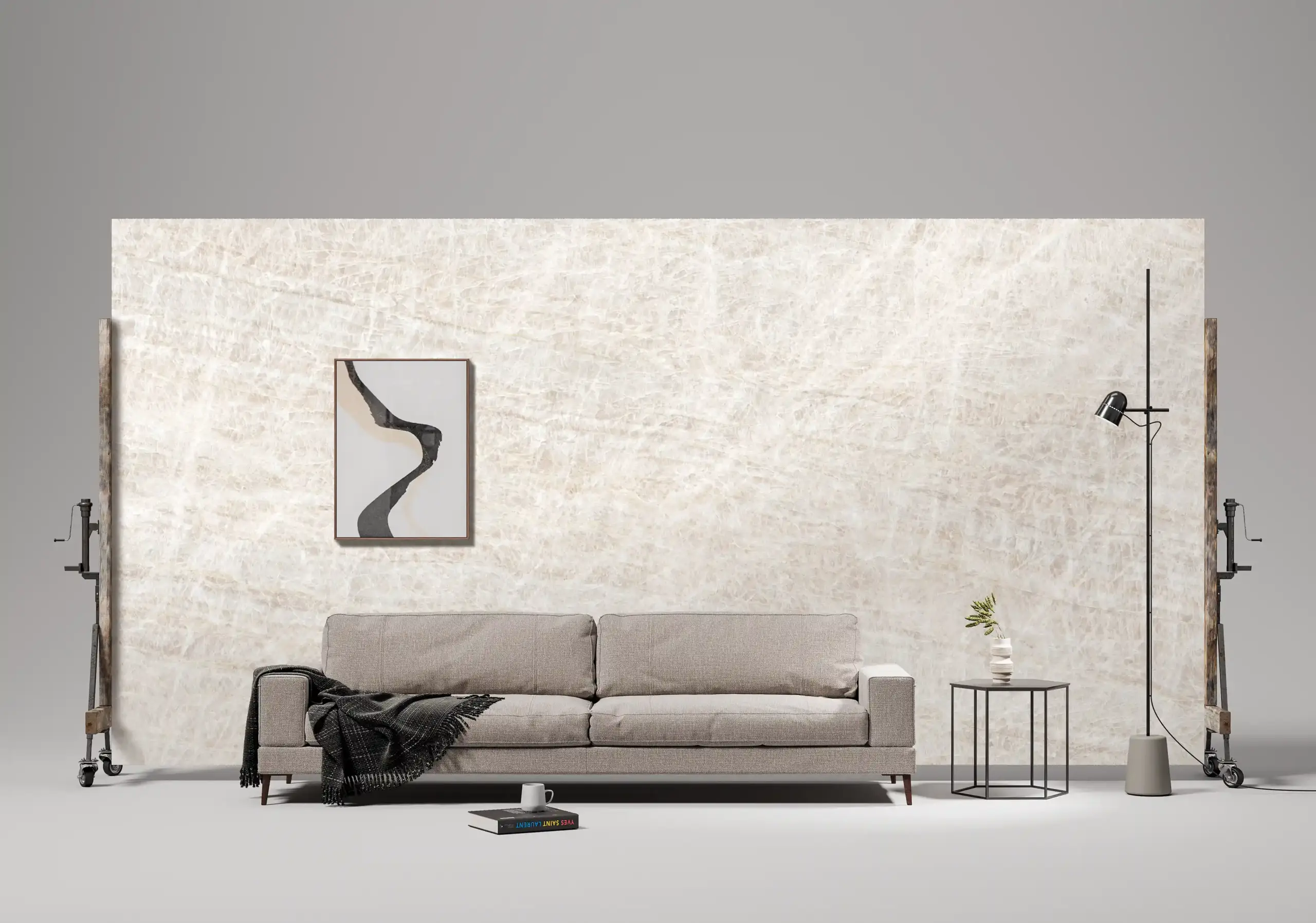 冰冷、堅硬是大部分人對於石材的既定印象,我們試著改變這樣的印象,透過表面柔光加工技術,讓石材在霧感質地之下,增添了親膚柔拋的觸感,不同於傳統石材的冰冷,當肌膚碰觸柔拋表面時能感受到石材的一絲柔軟,柔拋表面同時讓光線產生散射光效果,讓石材維持低光澤度及低反光率,同時表面質感更加柔和,當光線灑在表面時,也能看到光感細膩潤澤,將人與光與居家環境達到平衡,營造出視覺舒適且具有藝術情調的溫暖空間,保留自然紋路的低調奢華,滿足視覺與觸覺兩方面滑順柔和。